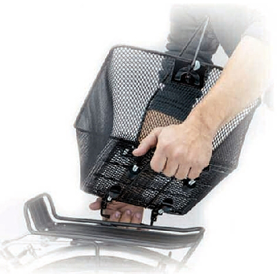 Standardkorb mit Tragebügel, abgeschrägt mit Klemmbefestigung am Gepäckträger. Ermöglicht leichtes Anbringen und Abnehmen des Korbes. Grösse: 390 x 300 x 150 mm