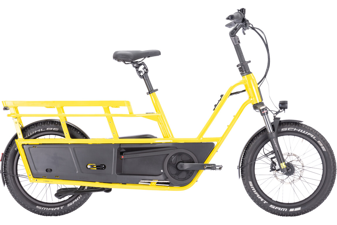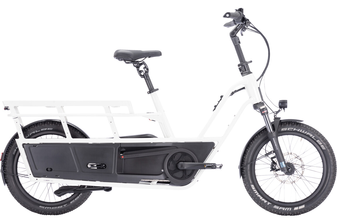 Das FLAIR L-N ermöglicht mit seinem modularen Trägersystem maximale Flexibilität bei der Kinderbeförderung wie beim Lastentransport. So können z.B. zwei Kindersitze montiert werden. Für größere Kinder gibt es alternativ einen Kindersattel mit Haltestange und Rückenlehne, den „Master Seat“. Der Gepäckträger lässt sich natürlich auch als solcher verwenden – ein Frontträger kann ebenfalls mit Einkäufen etc. beladen werden. Mit 250 kg zulässigem Gesamtgewicht*** bietet das E-Lastenrad reichlich Kapazitäten für schwere Lasten. Die neuste Bosch Antriebstechnologie (Smart System) mit dem maximalen Drehmoment von 85 Nm schiebt auch ein vollgepacktes FLAIR souverän an und der 600 Wh Akku liefert die nötige Energie auf langen Strecken. Die Hydraulikbremsen von MAGURA verzögern sicher und zuverlässig während die voluminösen 20 Zoll Reifen dafür sorgen, dass der Komfort stimmt. Mit dem verstellbaren Vorbau kann es optimal auf verschiedene Körpergrößen angepasst werden. Ein weiteres großes Plus sind seine kleinen Abmessungen, sie entsprechen denen eines konventionellen Tourenrades.