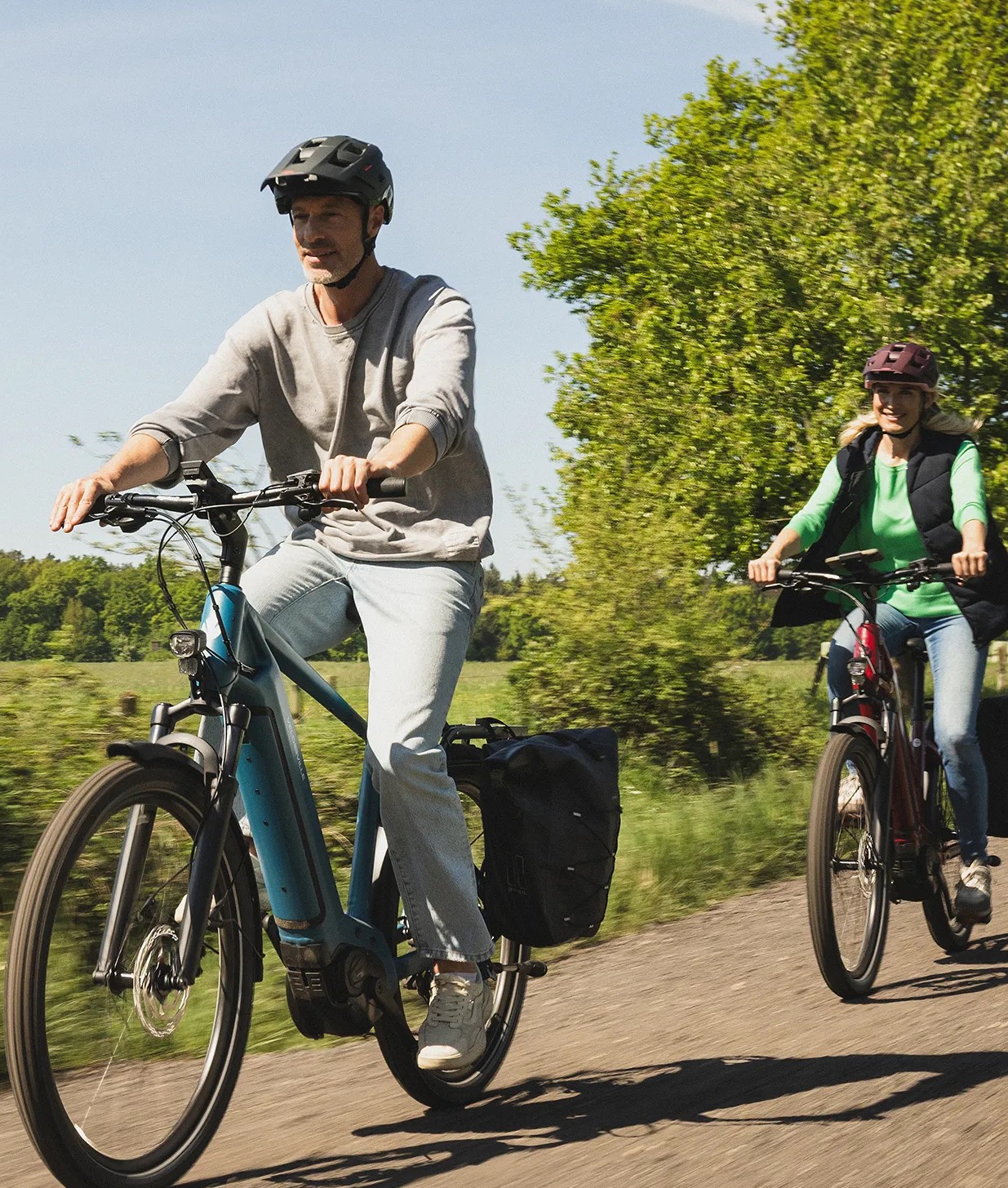 Sehr bequem, sicherer Halt auf losem Untergrund, ideal für Offroad oder viel Gepäck – etwas mehr Rollwiderstand.